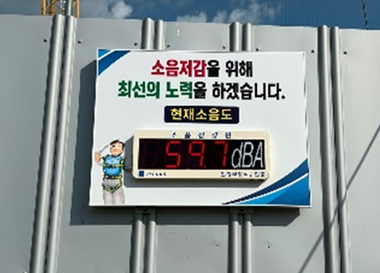건설현장 인근 주민들의 소음·진동 피해를 선제적으로 예방하기 위해 파일 항타 및 알폼 해체 시 소음방지 판넬과 이동식 방음벽을 설치하여 법적 기준보다 강화된 기준으로 소음 저감을 위해 노력하고 있습니다.