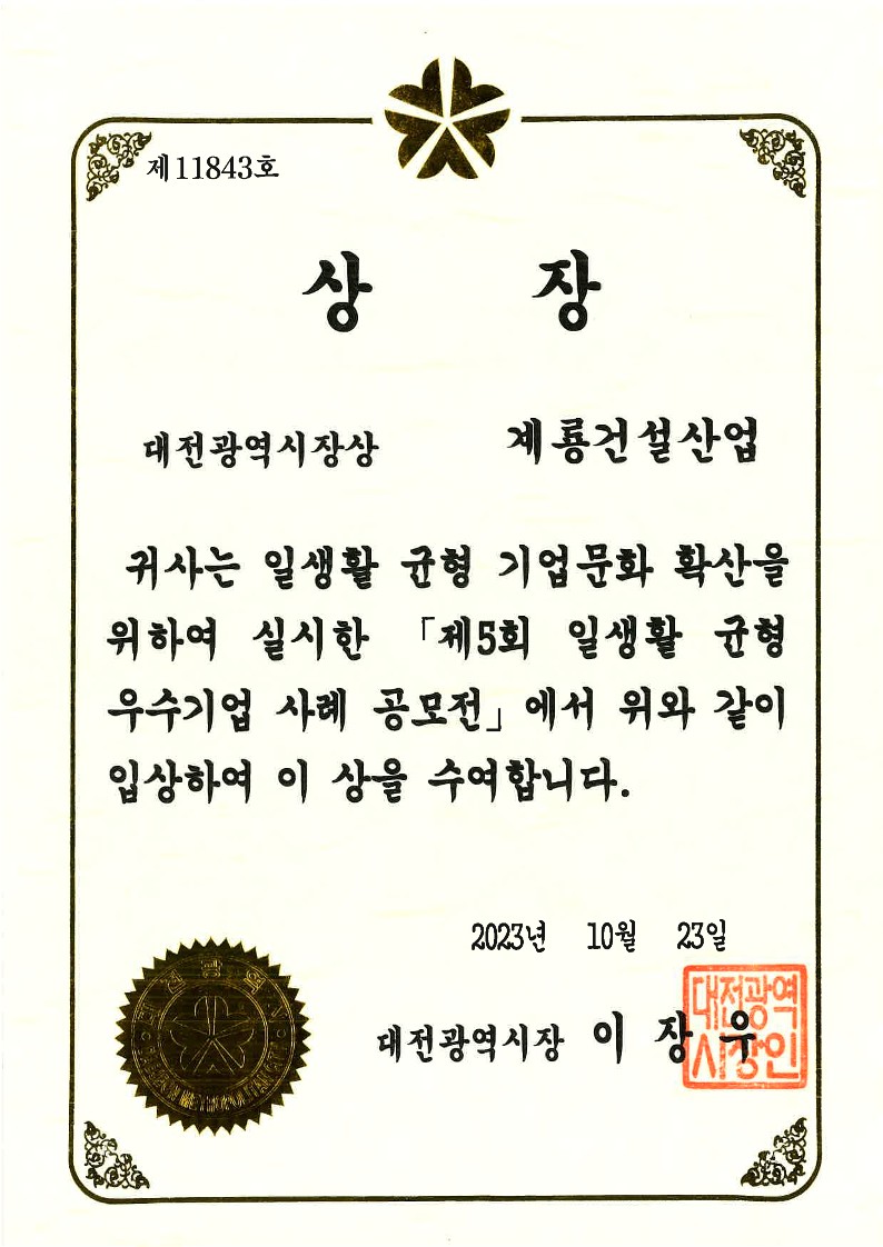 | 2023년 11월 | 대전광역시 | 일생활균형 우수기업 |