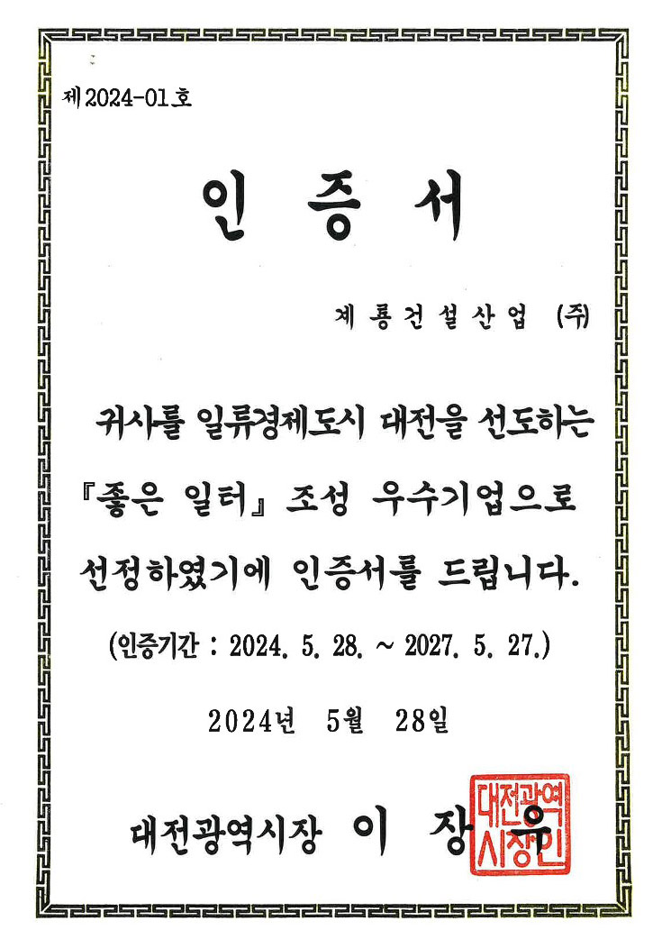 | 2024년 5월 | 대전광역시 | 좋은 일터 조성 우수기업 |