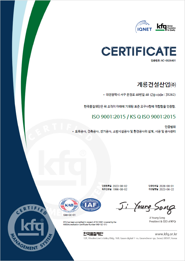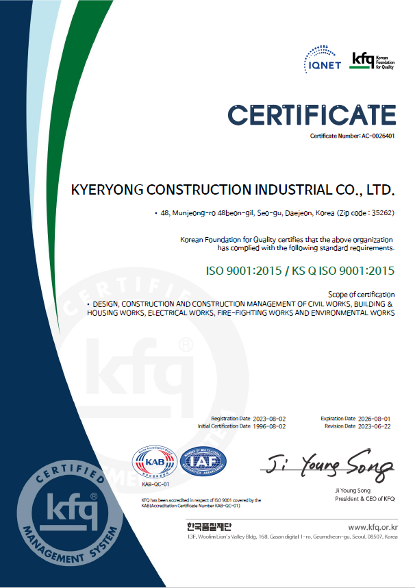 계룡건설은 ISO 9001(품질경영시스템)을 기반하여, 주택, 건축, 토목 등 전 부문을 망라하는 사업영역에 환경경영시스템을 적용·운영하고 있습니다.