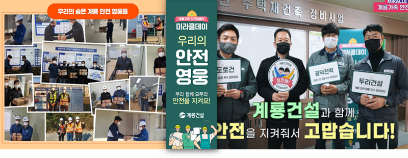 계룡건설은 안전수칙의 준수를 일상화하고, 자발적으로 안전에 대한 의식을 높이기 위해, 모든 구성원들이 참여할 수 있는 사내 안전 캠페인을 정기적으로 진행하고 있습니다.